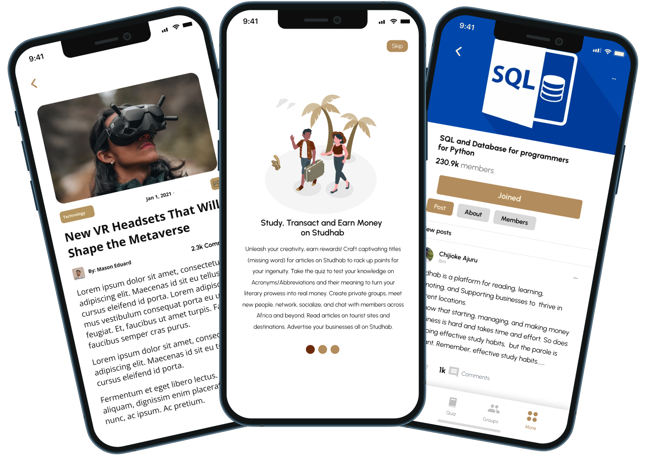 Unleash your creativity, earn rewards! Craft captivating titles (missing word) for articles on Studhab to rack up points for your ingenuity. Take the quiz to test your knowledge on Acronyms/Abbreviations and their meaning to turn your literary prowess into real money. Create private groups, meet new people, network, socialize, and chat with members across Africa and beyond. Read articles on tourist sites and destinations. Advertise your businesses all on Studhab.